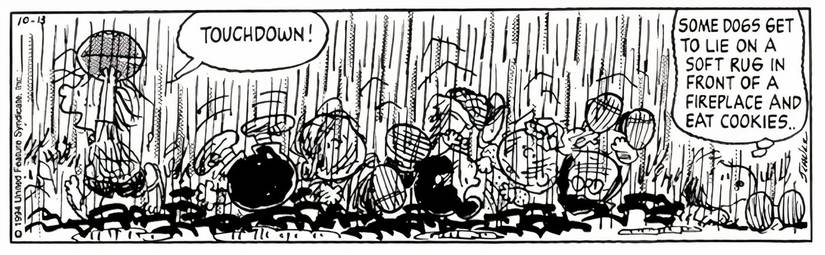 El cómic de Snoopy indica que no le importa estar cubierto de barro, o que Marcie ni siquiera parece conocerlo por su nombre. Snoopy está feliz de ser incluido. Parece que Snoopy podría haberse apresurado a desear la vida de un perro de interior, ya que ciertamente no habría sido incluido en esta pelota de fútbol si lo fuera.