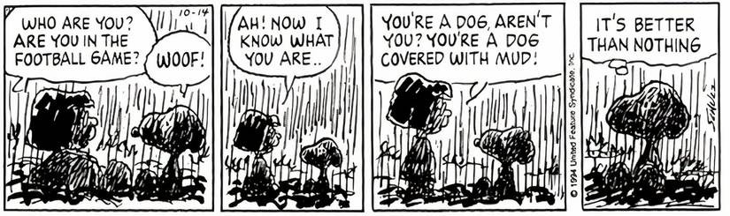 Durante ese mismo partido de fútbol, ​​Marcie se encuentra con Snoopy, y ambos están tan cubiertos de barro que al principio Marcie no tiene idea de con quién está hablando. Sin embargo, después de que ella le pregunta a Snoopy quién es, él responde con un “guau“, Marcie sabe que es un perro cubierto de barro. Entonces Snoopy piensa para sí mismo: “es mejor que nada“, lo que hilarantemente invierte su sentimiento en la anterior Miseria cómic.