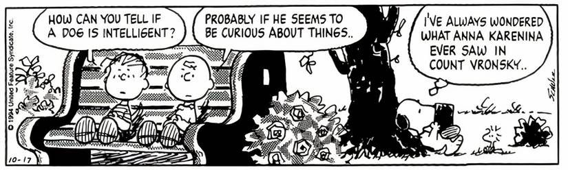 Linus y Charlie Brown están sentados juntos en un banco del parque mientras Snoopy está debajo de un árbol cercano, leyendo un libro. Linus le pregunta a Charlie Brown: “¿Cómo saber si un perro es inteligente?” a lo que Charlie Brown responde: “Probablemente si parece tener curiosidad por las cosas.“. Justo después de que Charlie Brown respondiera la pregunta de Linus, Snoopy se dice a sí mismo: “Siempre me he preguntado qué vio Anna Karenina en el Conde Vronsky…“.