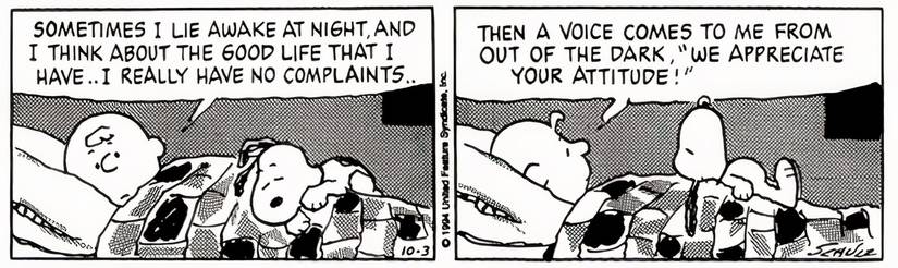 Mientras Charlie Brown está acostado en su cama, comenta lo bien que lo pasa y cómo a menudo piensa en todas las cosas positivas de su vida. Pero luego, Charlie Brown dice que, cada vez que estos pensamientos positivos inundan su mente, le asaltan pensamientos oscuros que son aún más poderosos. En este cómic, Charlie Brown revela que las ‘voces oscuras’ en su cabeza dicen: “apreciamos tu actitud“, como para decirle que su optimismo es admirable a pesar de su siempre presente desesperación.