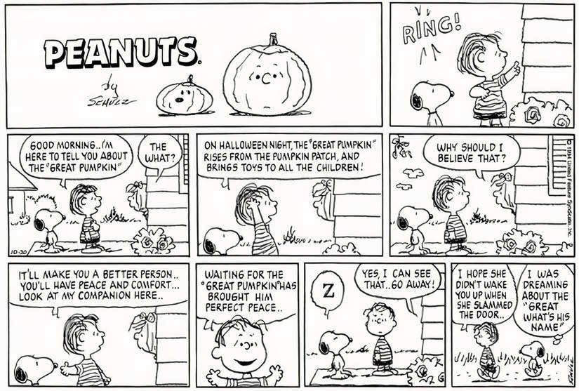El día antes de Halloween, Snoopy y Linus van de puerta en puerta difundiendo la “buena palabra” de la Gran Calabaza (como si representaran una religión organizada legítima). Cuando las personas con las que hablan les preguntan por qué deberían creer en la Gran Calabaza, Linus les dice que hacerlo les traerá paz y consuelo, e incluso señala a Snoopy como un excelente ejemplo de cómo es un verdadero creyente. Divertidamente, Snoopy elige ese momento para tomar una siesta rápida, como si estuviera tan en paz consigo mismo que pudiera desmayarse en cualquier momento y en cualquier lugar.