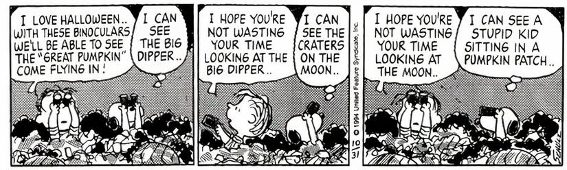 Después de pasar el día antes de Halloween tocando las puertas de la gente, contándoles sobre la Gran Calabaza, Snoopy y Linus se encuentran sentados en su huerto de calabazas local en la noche de Halloween, esperando la llegada de la Gran Calabaza.. Al igual que durante el sondeo, Linus tiene que mantener a Snoopy concentrado en su misión. En lugar de usar sus binoculares para buscar la Gran Calabaza, Snoopy los estaba usando para mirar las estrellas y, finalmente, mirar “un niño estúpido sentado en el huerto de calabazas“.