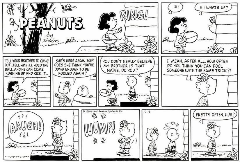 Miseria ha hecho el ‘broma de fútbol de Charlie Brown’ tantas veces a lo largo de la historia del cómic, pero en octubre de 1994, Charle M. Schulz decidió dar Miseria fans otra perspectiva del chiste clásico: la suya. Cuando Lucy llama a la puerta de Charlie Brown para ver si quiere patear el balón, Sally responde y dice que Charlie Brown tendría que ser un idiota para volver a caer en esto. Luego, el cómic permanece en Sally, lo que permite a los lectores observar su reacción ante la broma, una reacción que refleja la suya.
