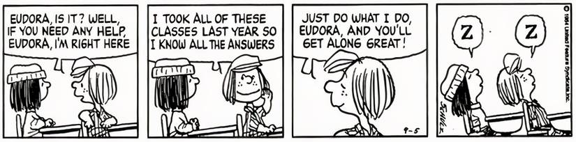 Peppermint Patty es una estudiante famosa y terrible, conocida por simplemente dormir durante sus clases, por lo que tiene sentido que la retuvieran un año. Sin embargo, lo que no tiene sentido es la confianza inmerecida de Peppermint Patty en su capacidad como estudiante, especialmente cuando se trata de dar consejos a niños nuevos. En este cómic, Peppermint Patty le dice a una chica nueva, Eudora, que haga lo que ella hace, ya que Patty ya ha tomado esta clase antes.