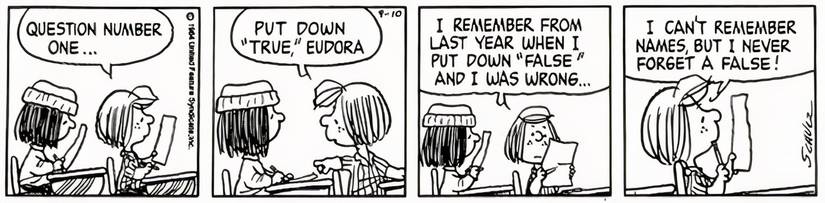Mientras realiza una prueba, Peppermint Patty lee la primera pregunta en voz alta para ella y para Eudora antes de darse la vuelta y decirle a la chica nueva que escriba “Verdadero” como respuesta. Aparentemente, Peppermint Patty tomó este cuestionario el año pasado, escribió “Falso” como respuesta y se equivocó en la pregunta. Por lo tanto, la respuesta correcta tenía que ser “Verdadero”, como dice la propia Peppermint Patty, “Nunca olvido un falso”.