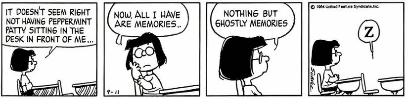 Al parecer, Marcie extraña tanto a Peppermint Patty sentada frente a ella que continúa imaginando la experiencia, como si Peppermint Patty hubiera muerto y Marcie simplemente no estuviera lista para dejarlo ir. De hecho, Marcie llama “fantasma” a este recuerdo de Peppermint Patty (incluso convenció a Franklin de que el escritorio en realidad estaba embrujado en una tira cómica anterior). En esta tira cómica, Marcie decide interactuar con el recuerdo de su amiga, pretendiendo despertar el ronquido incorpóreo. tal como solía hacer con Peppermint Patty.