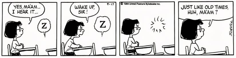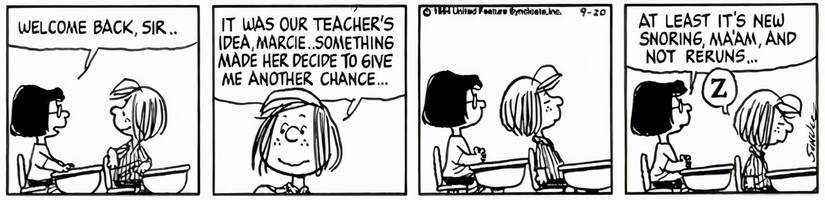 Parece que la escuela decidió que retener a Peppermint Patty era un error y lo solucionó haciéndola avanzar junto con su clase original. Eso significaba Peppermint Patty y Marcie estaban en el mismo salón de clases una vez más.y Marcie no podría haber estado más feliz. Aunque la experiencia fue exactamente como lo que Marcie estaba imaginando, aclara que tener de vuelta a Peppermint Patty fue genial, porque “Al menos son ronquidos nuevos, señora, y no repeticiones…”.