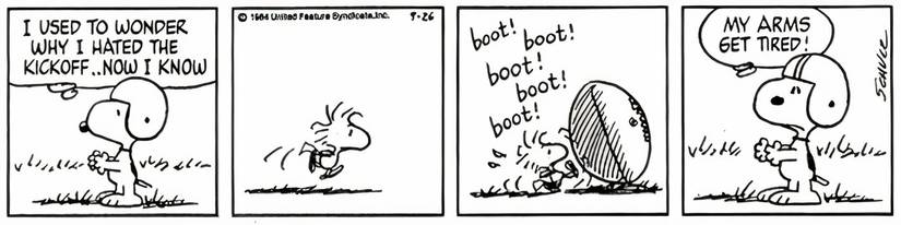 La broma de Peanuts con Charlie Brown a punto de patear una pelota de fútbol que Lucy sostiene, solo para que Lucy la retire en el último segundo, es tan icónica como hilarante.. Sin embargo, esta “mordaza futbolística” podría haberlo superado. Snoopy y Woodstock están jugando al fútbol y Snoopy está esperando el saque inicial. Woodstock comienza a correr y la patea con todas sus fuerzas… pero la pelota no se mueve. Mientras tanto, Snoopy recuerda por qué odia tanto el saque inicial”,¡Se me cansan los brazos!”.