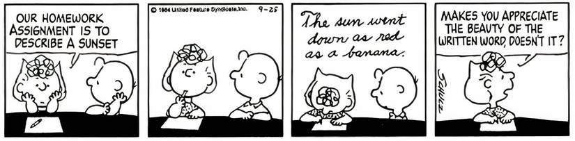 Charlie Brown se acerca a su hermana, Sally, en casa una tarde mientras Sally está trabajando en su tarea. Ella le dice a Charlie Brown que su tarea es describir una puesta de sol, presumiblemente en forma de poema. Entonces, Sally se pone manos a la obra y escribe la frase que, en su opinión, describe mejor la visión del sol poniente: “El sol se puso rojo como un plátano”. Mientras Sally está claramente satisfecha con lo que ha escrito, Charlie Brown simplemente se aleja sin decir una palabra.
