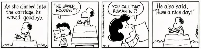 Snoopy está escribiendo la Gran Novela Americana encima de su caseta de perro y le ofrece un borrador de uno de los capítulos a Lucy, quien no reprime sus “críticas constructivas”. Lucy tiene un problema con la aplicación del romance que hace Snoopy en su historia, ya que señala que “él dijo adiós” no es una despedida muy romántica entre dos amantes. Entonces, Snoopy se toma en serio la crítica y corrige la frase con “También dijo: ‘¡Que tengas un buen día!’“.