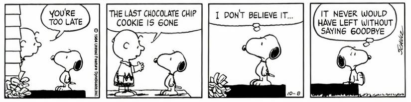 Snoopy llama a la puerta de la casa de Charlie Brown y Chuck sabe exactamente lo que busca su perro: comida, específicamente, una galleta con chispas de chocolate. Desafortunadamente, Charlie Brown tiene malas noticias para el cachorro ansioso de galletas. Charlie Brown le dice a Snoopy: “Llegas demasiado tarde. La última galleta con chispas de chocolate se acabó.“. Triste y desconsolado, Snoopy se aleja de la puerta incrédulo y se dice a sí mismo: “No lo creo… nunca se hubiera ido sin despedirse“.
