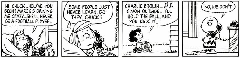 Peppermint Patty llama a Charlie Brown para quejarse de Marcie. En algunas tiras cómicas anteriores a esta, Peppermint Patty y Marcie jugaban al fútbol, y estaba claro que Marcie no tenía lo necesario para ser jugadora de fútbol. Patty le cuenta esto a Charlie Brown y le dice: “ella nunca será jugadora de fútbol” y eso “algunas personas simplemente nunca aprenden“. En ese momento, Lucy llama a Charlie Brown desde afuera de su casa y le pregunta si quiere patear la pelota mientras ella la sostiene. Al escuchar eso, Charlie Brown le responde a Patty: “No, no lo hacemos“.