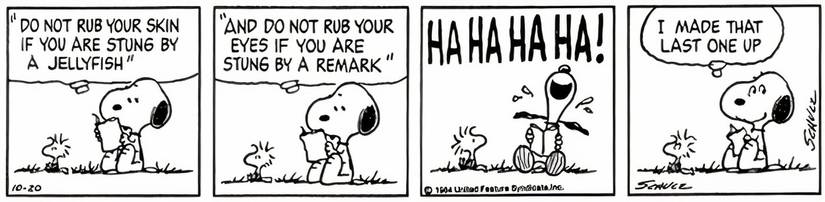 Snoopy y Woodstock están sentados juntos en el césped mientras Snoopy lee sobre qué no hacer si le pica una medusa. Snoopy lee en voz alta a Woodstock: “No te frotes la piel si te pica una medusa” antes de agregar “y no te frotes los ojos si te pica un comentario“. Después de decir esto, Snoopy se echa a reír mientras Woodstock se sienta en silencio junto a él, mirando confundido al perro histérico. Snoopy luego explica que él mismo inventó la última parte, la parte que le pareció tan divertida.