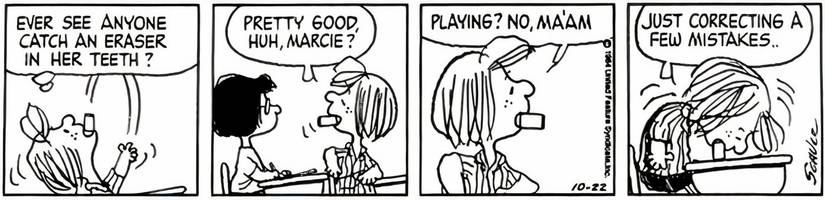 Un día, durante la clase, Peppermint Patty está jugando con un borrador, lo lanza al aire y lo atrapa con los dientes. Momentos después, la maestra llama a Peppermint Patty y le pregunta si está prestando atención. Peppermint Patty dice que sí y que no está jugando con su borrador, sino que lo usa para borrar un error que cometió en su papel. Patty luego procede a usar su borrador mientras todavía está en su boca.como si lo hubiera puesto allí deliberadamente para realizar esa tarea.