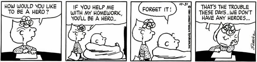 Cuando Sally está haciendo su tarea, llama a Charlie Brown y le pregunta a su hermano mayor si puede ayudarla con su tarea y que será su héroe si la ayuda. Sin embargo, Charlie Brown está viendo televisión, por lo que no hay forma de que deje de hacerlo sólo para ayudar a su hermana pequeña con las tareas escolares. Entonces, Sally vuelve a su tarea y se dice a sí misma: “Ese es el problema estos días… no tenemos héroes…“.