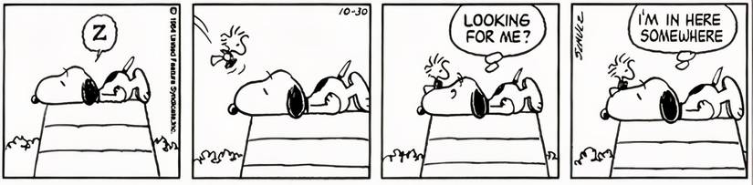 Snoopy está dormido encima de su caseta para perro cuando Woodstock vuela hacia él y aterriza directamente sobre la nariz de Snoopy. Esto despierta a Snoopy inmediatamente, pero claramente no del todo. Todavía aturdido y medio dormido, Snoopy le pregunta a Woodstock: “¿Buscarme?“antes de decir: “Estoy aquí en alguna parte“.