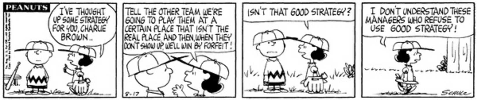Aparentemente, una victoria es una victoria en el libro de Lucy, sea justa o no. Sin embargo, Charlie Brown no aceptará nada de este plan y Lucy se siente frustrada porque el jefe de su equipo no reconoce su estrategia infalible. Debería haber sabido que Charlie Brown preferiría jugar limpio y recto; nunca ha sido de los que juegan rápido y libremente con las reglas.