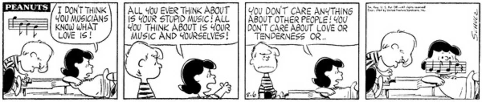 Lucy puede ser un poco dura, un hecho que nadie sabe mejor que Schroeder. Lucy intenta e intenta, sin éxito, que se aleje del piano y centre su atención en ella. En su punto de ruptura en esta tira, critica a Schroeder y a los músicos en general por tener una sola mente centrada en la música y nunca prestar atención al amor. Sucesivamente, Schroeder llega a su propio punto de quiebre, tocando en voz alta una melodía que ahoga el comentario de Lucy, representado hilarantemente en el panel final como notas musicales que oscurecen su boca.