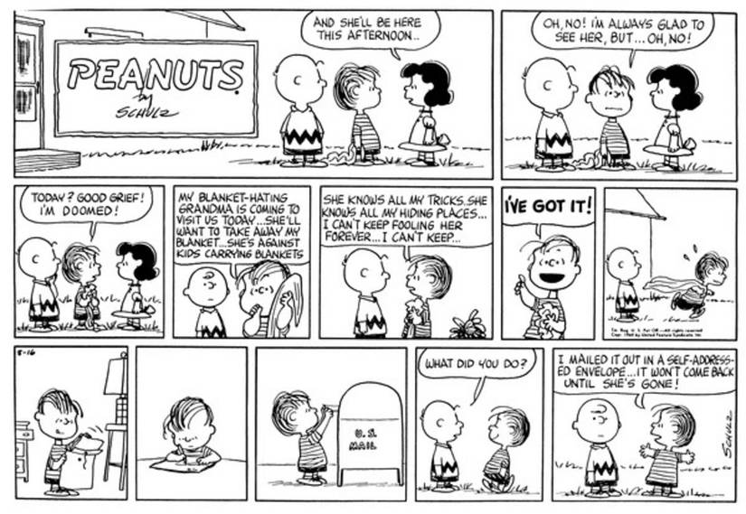 Linus tiene un apego especial a su manta de seguridad, más que cualquier niño. Hace todo lo posible para mantener su manta a salvo con él. Por mucho que Linus ame su manta, todavía hay personas (y perros) que intentan quitársela, incluida su propia hermana Lucy, Snoopy e incluso su abuela. Si bien Linus, por supuesto, ama a su abuela y le gusta cuando ella la visita, el hecho de que ella intente quitarle la manta es suficiente para llenarlo de pavor y miedo.