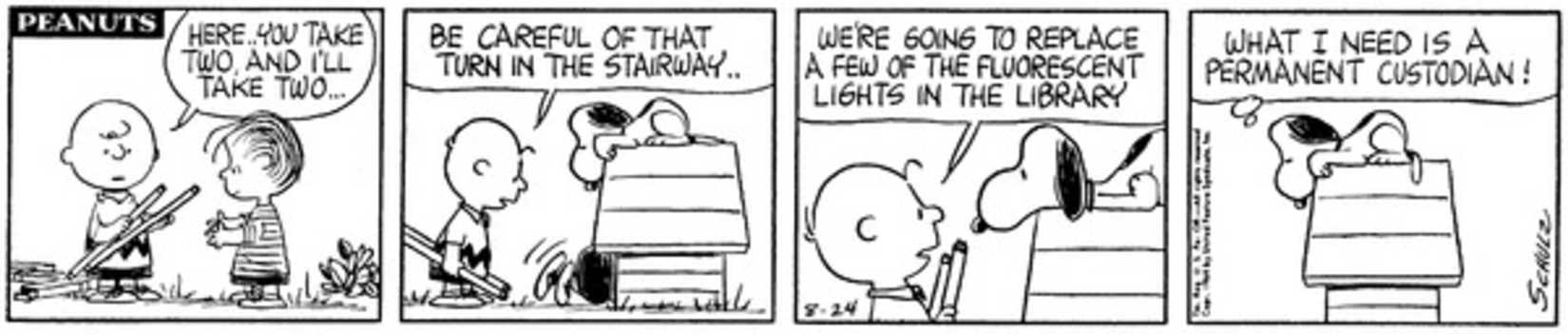 Dado que la caseta del perro de Snoopy parece ser un interminable laberinto de lujo, piensa que necesita un custodio permanente para su humilde morada. en lugar de que solo Linus y Charlie Brown realicen el mantenimiento de rutina según sea necesario. Aquí, es obvio que Snoopy es el rey de su castillo, lo que explica por qué no mueve un dedo para ayudar a Charlie Brown y Linus a reemplazar las luces de su propia casa.