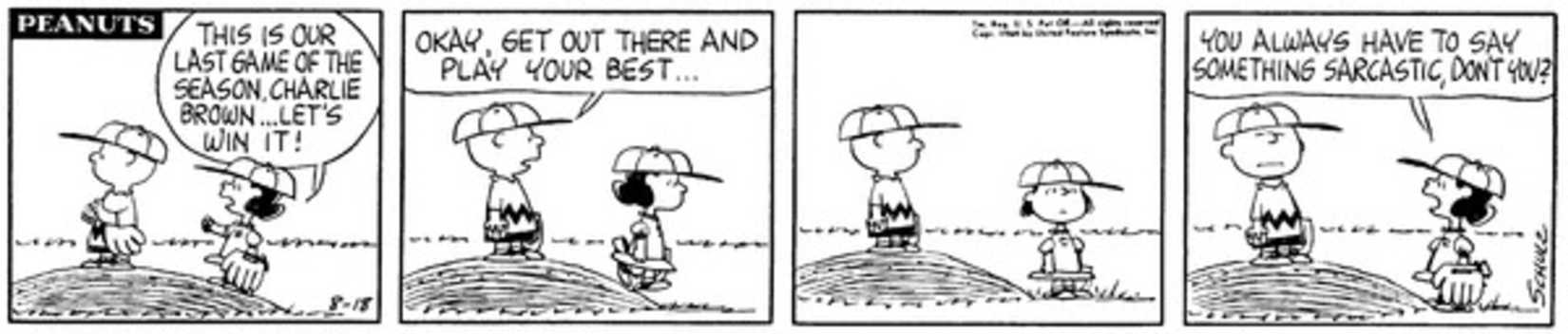 Sin embargo, Lucy no lo acepta. pensando que las palabras de Charlie Brown para que ella juegue lo mejor que pueda son solo su sarcasmo sobre sus terribles habilidades para jugar béisbol. Como de costumbre, Charlie Brown parece no poder complacer a nadie; Trató de motivar a Lucy y, en cambio, Lucy es insultada, en un clásico. Miseria un poco de falta de comunicación.