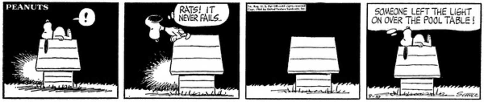 Sólo unos días antes, Miseria Los lectores se enteraron de que la caseta del perro de Snoopy tiene una biblioteca; ahora, aquí, Charles Schulz revela que también contiene una mesa de billar, Mientras Snoopy intenta dormir en su techo, sólo para ser despertado por una luz interior, que inmediatamente sabe que es la indicada.sobre la mesa de billar“.