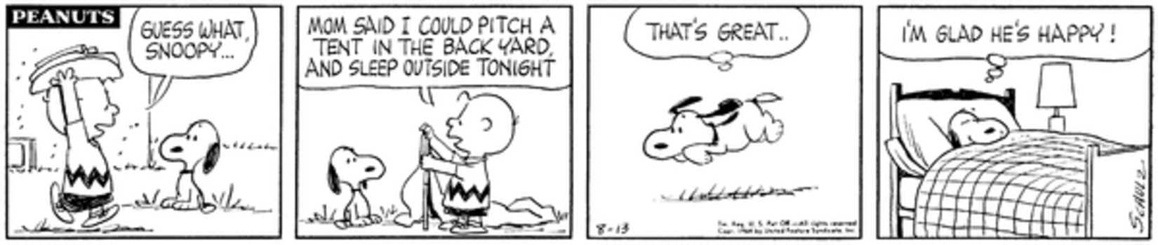 Para muchos niños, puede ser un placer acampar al aire libre, aunque sea sólo en el patio trasero. Charlie Brown deja de lado su neuroticismo por la noche y con entusiasmo le dice a Snoopy que su madre le permite dormir en una tienda de campaña en el patio trasero. Snoopy también parece muy feliz con esto, no debido a ningún tipo de emoción por poder acampar juntos, sino porque eso significa que podrá dormir en la cama de su dueño.
