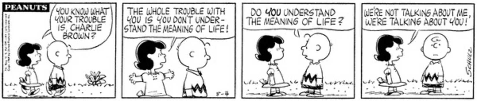 A Lucy le gusta considerarse una psiquiatra y una especie de entrenadora de vida. ¿Tiene ella la naturaleza afectuosa para realizar tales tareas? No, en absoluto, pero eso nunca antes había detenido a Lucy, como se ve en este memorable Miseria tira cómica. Reprendiendo a Charlie Brown por no entender el significado de la vida, Charlie Brown le da la vuelta y le pregunta si lo entiende, a lo que ella hace un desvío clásico y le recuerda que están hablando de él, no de ella.