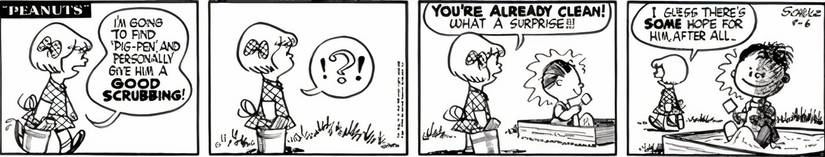 Un día, Patty decide que ya es suficiente cuando se trata de que Pig-Pen siempre esté sucio. Ella pisa fuerte hacia donde Pig-Pen está jugando en una caja de arena y dice que ella misma le dará un baño. Pero, cuando Patty lo ve, descubre que Pig-Pen ya se ha bañado. Sin embargo, el cómic luego cambia de perspectiva y muestra que Pig-Pen solo limpió la mitad de su cuerpo, mientras que la otra mitad estaba tan sucia como siempre.