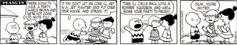 Parece que sus extravagantes amenazas funcionaron, ya que Violet y Patty preferirían tener a Charlie Brown en su fiesta antes que correr el riesgo de ser destrozados por sus aviones de combate. (que obviamente no tiene). Claramente, Charlie Brown toma medidas extremas cuando no se siente incluido, y esta vez, realmente valió la pena.