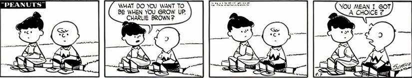 Charlie Brown y Violet están sentados juntos en la acera, y Violet le pregunta qué quiere ser cuando sea mayor. Charlie Brown hace una pausa por un momento y luego responde: “Quieres decir que tengo una opción“. Aparentemente, Charlie Brown nunca antes había pensado en esta pregunta en particular, asumiendo que simplemente caería en una carrera predeterminada. después de haber terminado la escuela. Ésa es una perspectiva bastante sombría sobre el crecimiento, especialmente para un niño.