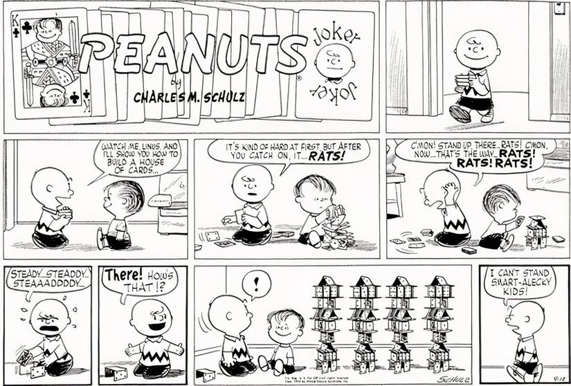 Charlie Brown está mirando a Linus un día y decide mostrarle al niño cómo construir un castillo de naipes. Mientras Charlie Brown intenta demostrarlo, sigue fallando las cartas y ni siquiera puede apilar tres cartas una encima de la otra. Entonces, Charlie Brown finalmente lo entiende, pero cuando se gira para mostrárselo al niño, descubre que Linus había construido un impresionante castillo de naipes sin la ayuda de Charlie Brown. Chuck se aleja enojado, murmurando que odia “niños sabelotodos“.