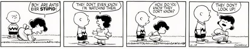 Charlie Brown se acerca a Lucy mientras ella mira al suelo y observa un grupo de hormigas. Cuando se fija en él, Lucy le comenta a Charlie Brown que cree que las hormigas son estúpidas porque “Ni siquiera saben que los estoy mirando“. Charlie Brown luego cuestiona esa afirmación y le pregunta a Lucy: “¿Cómo sabes que no lo saben?” y Lucy responde: “¡No miran hacia arriba!“.