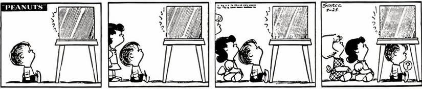 Linus está sentado en el suelo frente a su televisor, disfrutando de lo que tiene puesto. Luego, a Linus se le une su hermana, Lucy, quien se sienta justo detrás de él y lo acerca al set. Luego, la amiga de Lucy, Patty, entra y se sienta detrás de Lucy, acercando a Lucy y Linus al televisor. Pero Linus, que estaba sentado muy cerca del televisor desde el principio, se desliza demasiado y termina justo debajo del televisor.