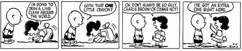 Lucy está tratando de trazar una línea alrededor del mundo.y la única crítica que tiene Charlie Brown es que lo hace con un crayón. Luego, Lucy saca un crayón de respaldo, lo que indica que ella tenía la misma preocupación e hizo esfuerzos para asegurarse de que nada se interpusiera en su camino. Pero lo único que ninguno de los dos se detuvo a considerar es que es imposible trazar una línea alrededor del mundo, con crayón de respaldo o no.