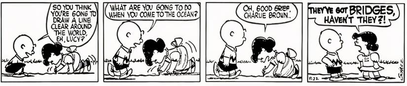 Después de que Lucy aclara el problema del crayón, a Charlie Brown se le ocurre otro problema con el que se encontrará Lucy. Charlie Brown pregunta: “¿Qué vas a hacer cuando vengas al océano?” a lo que Lucy responde: “Dios mío, Charlie Brown. Tienen puentes, ¿no?“. Lucy realmente ha pensado en todo, y el constante interrogatorio de Charlie Brown no es más que una charla irritante para ella.