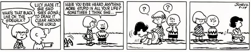 Todo el mundo sabe que un chiste es tan bueno como su remate y, en este caso, el más divertido de Lucy. Miseria El chiste tiene el perfecto. Patty y Charlie Brown están juntos cerca de una sección de la fila de Lucy, y Charlie Brown explica lo que Lucy está tratando de hacer. Después de aceptar que eso es ridículo, Patty y Charlie Brown notan que no han visto a Lucy desde hace unos días. Luego, Lucy sale de la nada y conecta la línea que está dibujando con su punto de origen, y luego se aleja, dejando a Patty y Charlie Brown en un estado de absoluta incredulidad.
