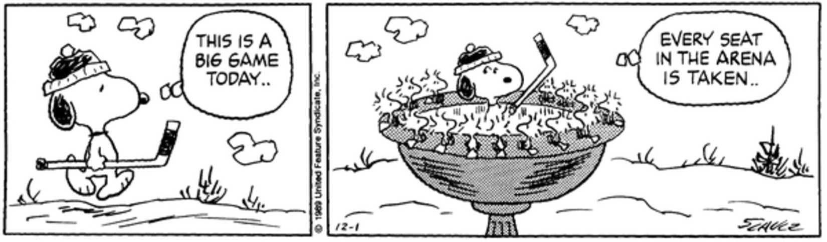 Aquí, Snoopy tiene un gran partido de hockey, con su área de baño para pájaros congelada llena hasta el tope de espectadores de aves. que han ocupado todos los asientos. Después de que Lucy y Violet expulsaron a Snoopy de la pista de hielo muchas veces, él gira y hace de un bebedero para pájaros congelado su propia pista. Curiosamente, en este día en particular, el juego atrae a una audiencia inusualmente grande.