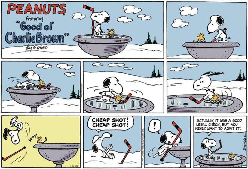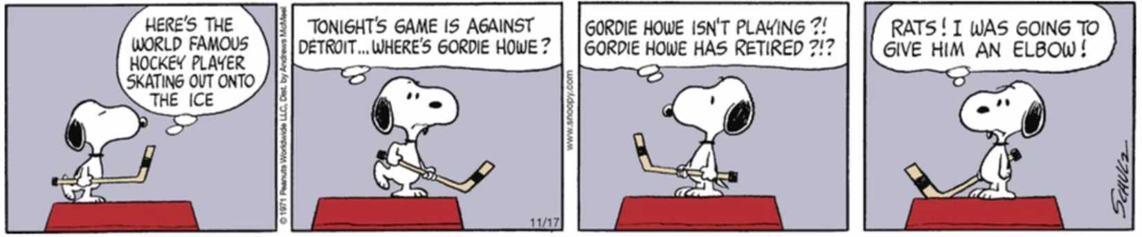 Como su personaje de jugador de hockey mundialmente famoso, Snoopy se imagina jugando contra el jugador de hockey profesional Gordie Howe. Sin embargo, el plan de Snoopy se arruina. cuando descubre que Gordie Howe no está jugando porque está retirado, desperdiciando la oportunidad de Snoopy de “dale un codazo“. Como deja claro este cómic, Snoopy puede abrazar absolutamente la naturaleza agresiva del hockey cuando así lo desee.
