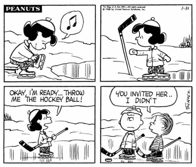 En esta tira, Lucy intenta ser una buena jugadora de hockey junto a Charlie Brown y Linus. Desafortunadamente para ellos y para todo el equipo involucrado, Lucy ni siquiera sabe que en este deporte se utiliza un disco en lugar de una pelota. Todo lo que Charlie Brown puede hacer en respuesta a este evidente mal comienzo es poner los ojos en blanco, mientras Linus señala que el propio Charlie Brown tiene la culpa, ya que la invitó a jugar.
