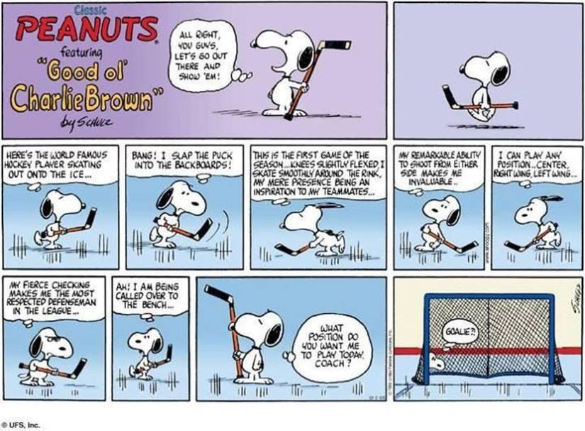 Snoopy ya había adoptado su personaje de jugador de hockey mundialmente famoso, por lo que es natural que se otorgara otro título prestigioso: portero de hockey mundialmente famoso. Su talento en la posición de portero habla por sí solo en esta historieta, con Linus, o cualquiera de los otros. Miseria niños, de hecho, no tienen ninguna posibilidad contra el temible Snoopy como portero. Si bien la estrategia de Snoopy puede no ser la más justa, hace el trabajo.