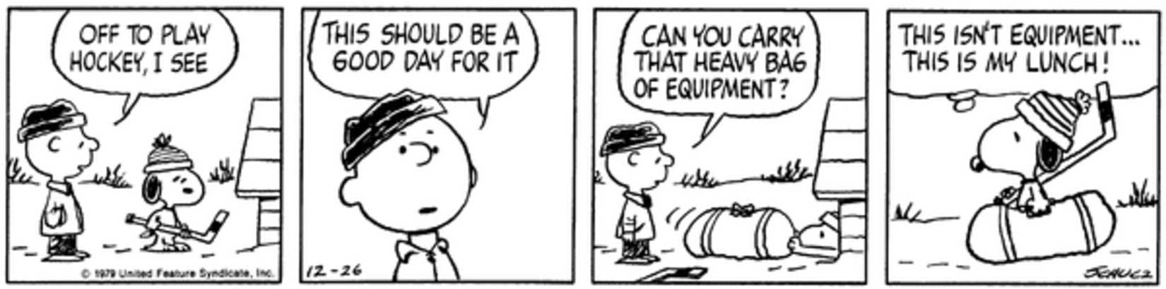 Snoopy es un perro pequeño con mucho apetito. Vive para comer, no come para vivir, y saborea todas sus comidas y bebidas favoritas, como cerveza de raíz, galletas con chispas de chocolate y pizza. Su amor por la comida hace una aparición inesperada en una tira cómica centrada en el hockey. Con Snoopy todo vestido y listo para jugar hockey, trae consigo una bolsa de aspecto pesado. Para sorpresa de Charlie Brown, La bolsa de Snoopy no está llena de equipo de hockey. – eso sería demasiado lógico para Snoopy – pero con el gigantesco almuerzo de Snoopy.