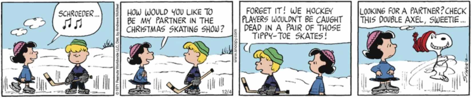 El enamoramiento masivo de Lucy por Schroeder es infame en Miseria tradición, y a menudo eso la llevó a hacer grandes esfuerzos para pasar tiempo con él. En este panel, Lucy le pide a Schroeder que sea su compañero en el espectáculo navideño de patinaje. pero él no está de acuerdo en absoluto y responde con dureza que, como jugador de hockey, no participará en el patinaje artístico.