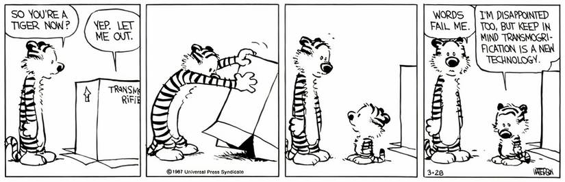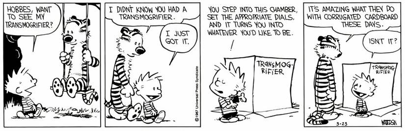 En la tira cómica en la que se presentó el Transmogrificador de Calvin, el niño de seis años se lo muestra emocionado a Hobbes. Le explica que su nuevo invento puede transformar a cualquiera en cualquier cosa, desde animales e insectos hasta dinosaurios. Sin embargo, no es el dispositivo en sí lo que impresiona a Hobbes, sino de qué está hecho. Hobbes observa atentamente el Transmogrificador y dice: “Es sorprendente lo que hacen con el cartón corrugado hoy en día.“.