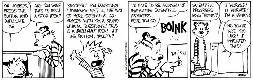 Cuando Calvin se alaba a sí mismo por ser un genio, la voz de su duplicado lo llama mentiroso, diciendo que él fue quien creó al Duplicador, y que la primera voz fue el clon. Esto es lo mismo El horror existencial que aparece en prácticamente todas las “historias de clonación”, y Calvin y Hobbes lo están experimentando. para ellos mismos.