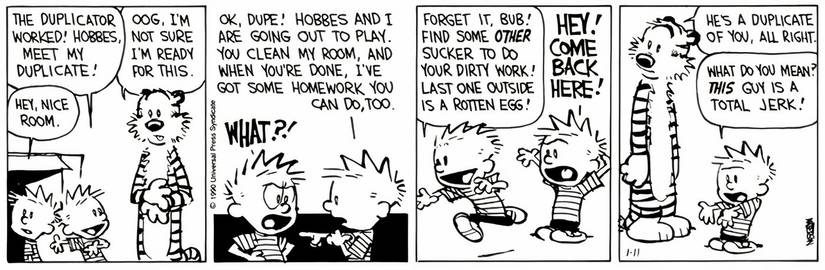 Después de liberar a su clon, Calvin revela la razón por la que lo creó: para limpiar su habitación y hacer sus tareas para que él y Hobbes pudieran salir a jugar. Cuando el clon de Calvin escucha esto, rechaza de inmediato el propósito de su creación y, en cambio, sale corriendo antes de que Calvin pueda obligarlo a hacer algo de eso. Cuando el clon de Calvin se va, Hobbes comenta: “Él es un duplicado de ti, ¿de acuerdo?“, a lo que Calvino responde indignado: “¿Qué quieres decir? ¡Este tipo es un completo imbécil!”