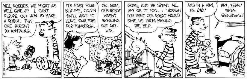 Calvin y Hobbes pasaron todo el día creando este robot, pero por más que lo intentaron, no pudieron hacerlo funcionar. Justo cuando estaban a punto de tirar la toalla, llegó la hora de dormir de Calvin. En otras palabras, Al pasar todo el día creando un robot para hacer la cama, Calvin se libró de hacer su cama.lo que significa que técnicamente el robot cumplió su propósito, pero no como se esperaba.