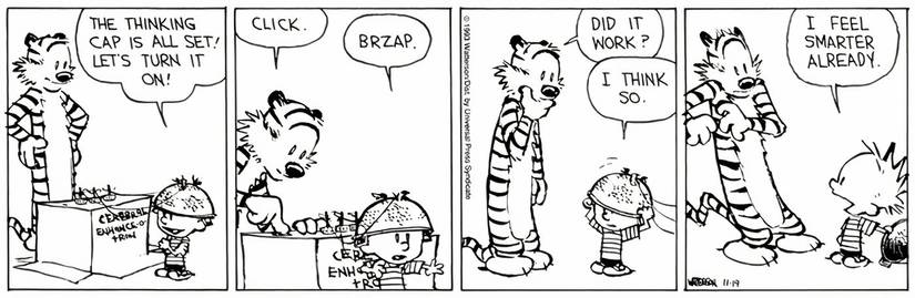 Cuando Calvin necesita ser más inteligente para la escuela, decide que en lugar de estudiar, simplemente va a inventar un dispositivo que lo hará más inteligente con solo presionar un botón: el Cerebral Enhance-O-Tron. Hecho con una caja de cartón y un colador de pasta conectado con una cuerda, el “gorro para pensar” de Calvin funciona demasiado bien. No solo hace lo que promete y lo hace más inteligente, sino que también Agranda la cabeza de Calvin hasta un grado cómico..