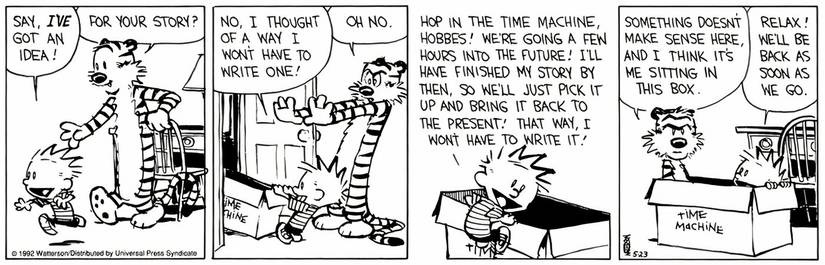 Calvin siempre ha despreciado hacer los deberes y encontrará cualquier excusa para no hacerlo, incluso para romper el tejido mismo de la existencia. Calvin decide construir una máquina del tiempo (sorpresa, con una caja de cartón) y planea Avanzar unas horas en el tiempo para robarle la tarea terminada a su yo futuro.y traerlo al pasado. Como sabe cualquier fanático de la ciencia ficción basada en viajes en el tiempo, esto crearía una paradoja que podría destrozar el universo. Menos mal que es imaginario.
