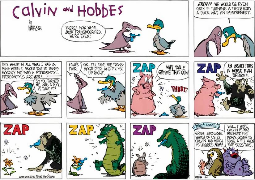 Hobbes convierte a Calvin en un pequeño pterodáctilo, y Calvin convierte a Hobbes en un pato. Ambos están disgustados con lo que ha hecho el otro, así que se arrebatan el arma transmutadora uno al otro mientras transforman al otro en cosas cada vez más absurdas, como un cerdo parlante y una flor sensible, y es absolutamente hilarante.